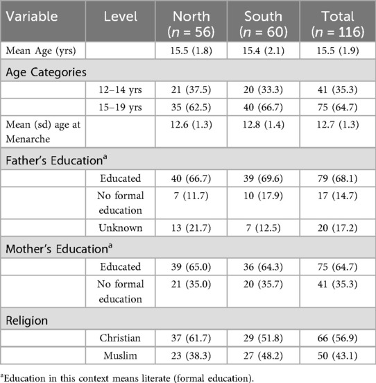 Participants from both sites had similar ages (p = 0.76) ranging between 12 and 19 years. Almost equal numbers of participants were drawn from the three levels of education: primary (31.9%), junior high school (33.6%), and senior high school (34.5%). Mean age at menarche, the occurrence of first menstruation, was 12.7 years. Northern participants (12.8 years) had a slightly higher age at menarche than Southern participants (12.6 years). About 55.2% of participants were in their late menarche (Delayed puberty). There were slightly more Christians (56.9%) than Muslims (43.1%). The data indicate that fewer mothers (64.7%) than fathers (68.1)had some level of education. Table 1 presents the relevant background charecteristics of participant.
