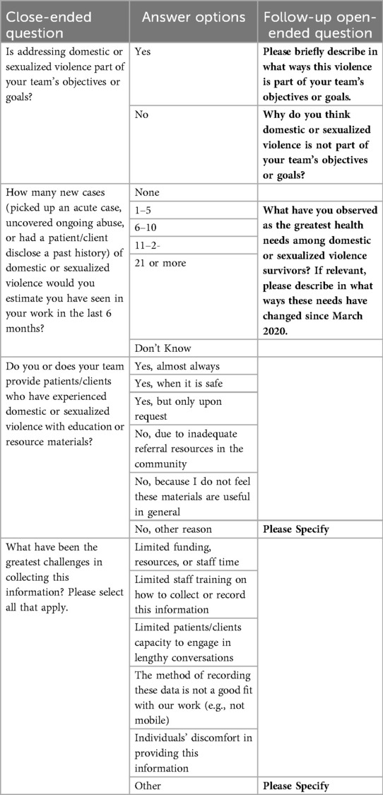 The survey had 16 open-ended questions, most of which were only shown to participants depending on survey skip logic (e.g., if a particular response to a close-ended question was selected). After an initial review of all questions, we focused our analysis on five that contained the richest data related to the current research objectives. These questions focused on: the relationship between violence and team goals, patients' health needs, and challenges and opportunities in responding to domestic or sexualized violence (see Table 1 for a summary of the questions and skip logic involved). Participants must have answered at least one of these open-ended questions to be included in the sample.