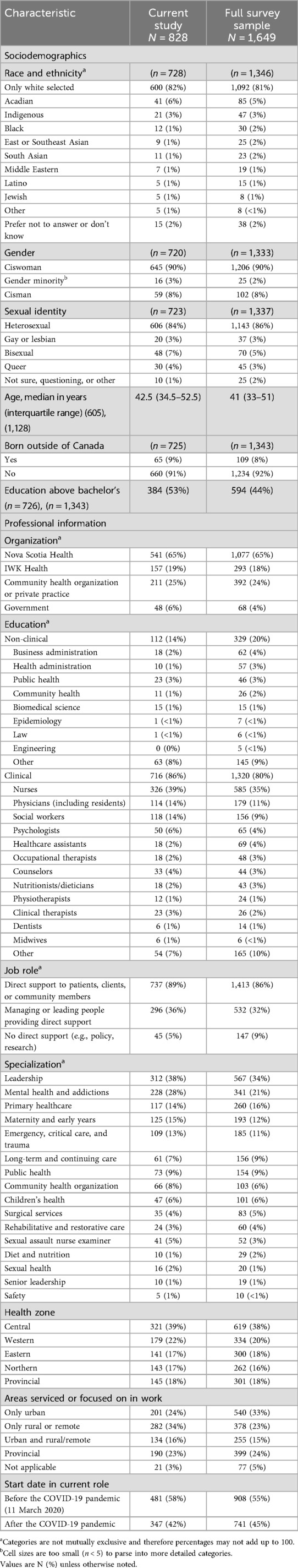 There were 1,649 participants in the survey, 50% of whom (n = 828) responded to at least one open-ended question. Table 2 summarizes the sociodemographic and professional characteristics of the 828 participants who responded to at least one open-ended question, compared to the total sample. There were no meaningful differences between these two groups.