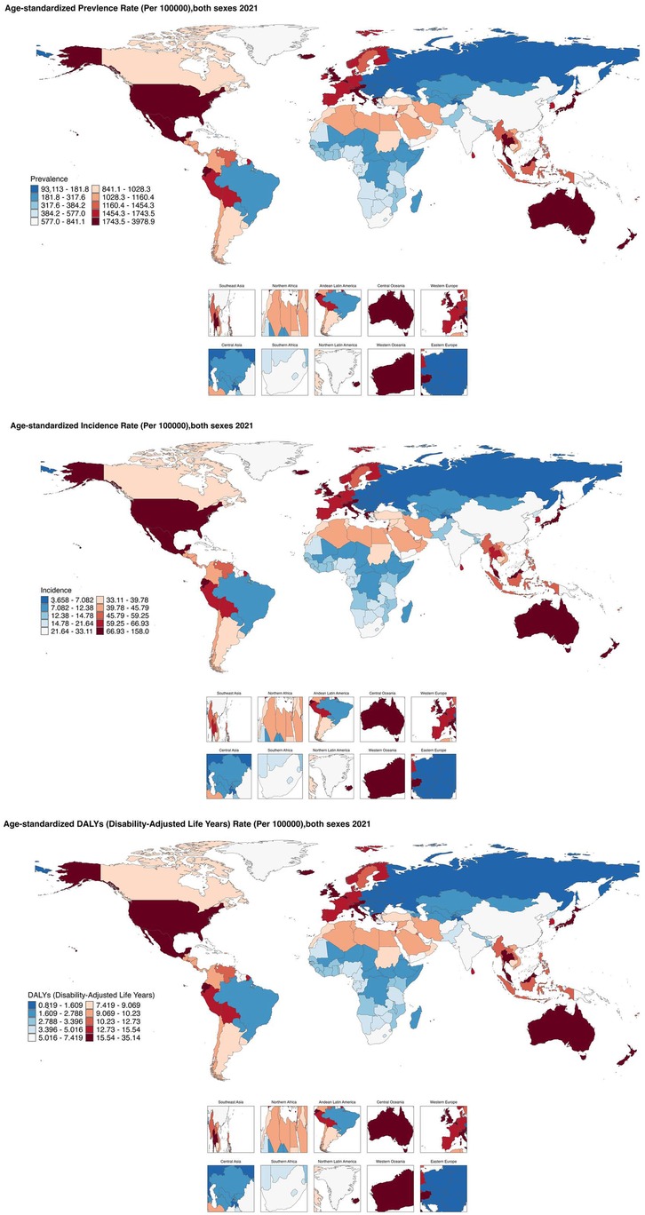 Three world maps illustrate various age-standardized rates for 2021: prevalence, incidence, and DALYs (Disability-Adjusted Life Years) for both sexes. The color gradients range from light blue to deep red, indicating lower to higher rates. Regions like the Americas and parts of Europe display higher rates, shown in darker shades. Inset maps provide detailed views of specific areas.