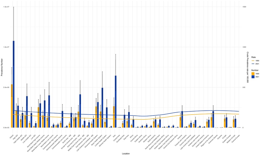Bar and line chart displaying the prevalence number and crude prevalence rate per 100,000 for various locations from 1990 to 2021. Orange and blue bars represent prevalence numbers, while lines indicate rates, both categorized by year. Error bars are visible on the bars.