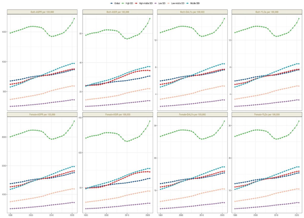 Ten line graphs display various health metrics per 100,000 people from 1990 to 2020, differentiated by Global, High, High-middle, Low, Low-middle, and Middle SDI. The metrics are ASPR, ASIR, DALYs, and YLDs for both sexes and females. Each graph shows different trends, with data generally increasing over time, especially since around 2010, except for the green line representing High SDI, which depicts a noticeable dip before rising.