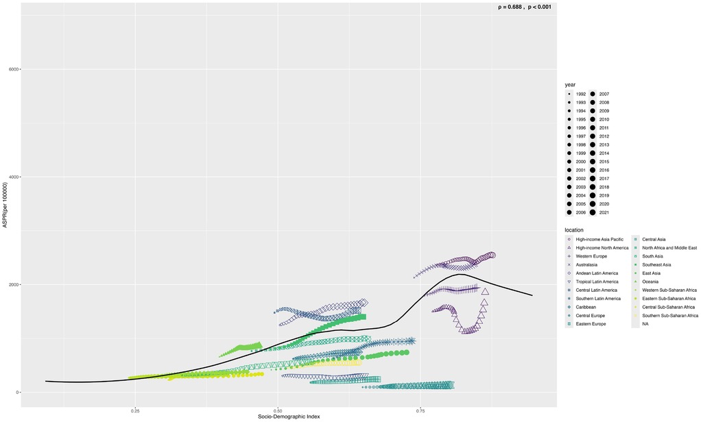 Scatter plot showing age-standardized prevalence rates (ASPR per 100,000) against the socio-demographic index from 1990 to 2021 across different regions, represented by various colored shapes. A black trend line illustrates a positive correlation. Legend indicates regions like High-income Asia Pacific, Western Europe, East Asia, and others, with data points spanning 1992 to 2021. Correlation coefficient is 0.688, with a p-value less than 0.001.