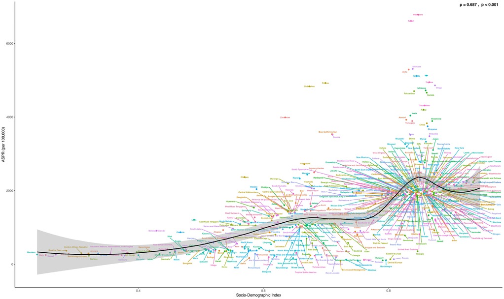 Scatter plot showing ASRPR (per 100,000) on the y-axis and Socio-Demographic Index on the x-axis. Points represent various geographical locations. A trend line with confidence interval indicates a positive correlation (\\( \\rho = 0.687, p < 0.001 \\)).