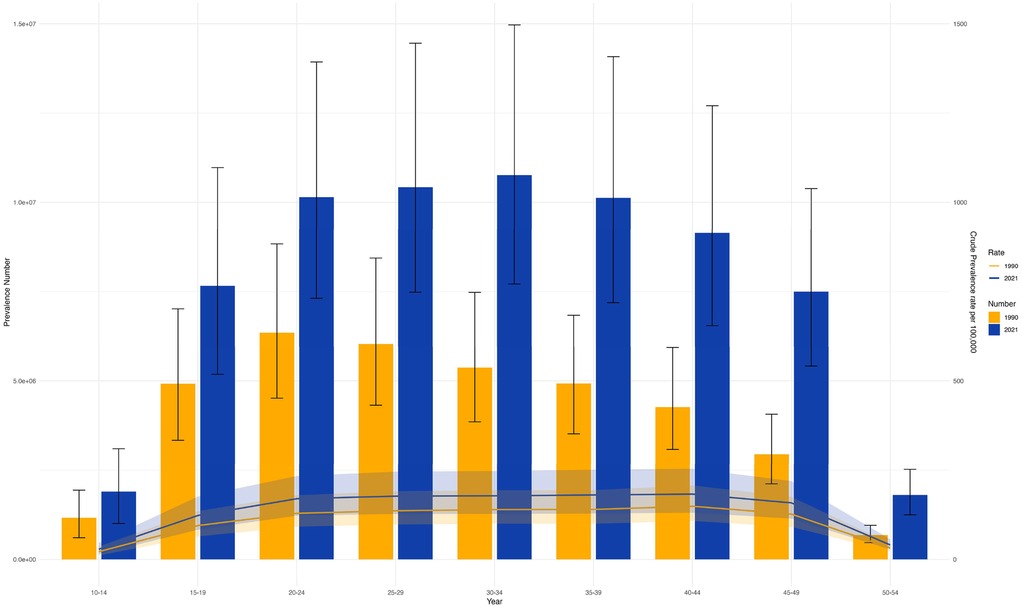 Bar chart showing prevalence numbers and crude prevalence rates per 100,000 across different age groups from 10-14 to 50-54 years in 1990 and 2021. Yellow bars represent 1990, and blue bars represent 2021. Error bars indicate variability, with generally higher numbers and rates in 2021 compared to 1990.