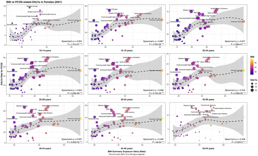 Methods: We reported the trends of prevalence, incidence, years lived with disability (YLDs), and disability-adjusted life years (DALYs) in 204 countries and regions, stratified by age and sociodemographic index (SDI). All estimates were presented as absolute numbers and age-standardized rates (ASR) per 100,000 population, with 95% uncertainty intervals [95% UI] and estimated annual percentage changes (EAPCs) with 95% confidence intervals [95% CI]. In addition, we examined the association between high body mass index (BMI) exposure and PCOS, including its comorbidity burden across different age groups, taking into account regional variations in high BMI exposure.