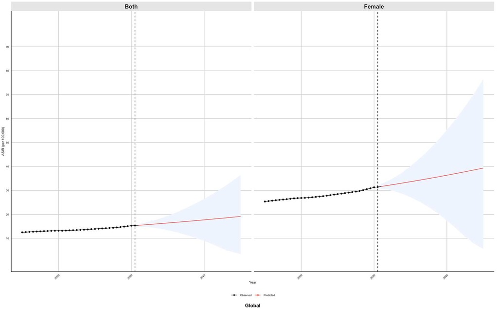 Line chart showing age-standardized rates per 100,000 from 2000 to 2040 for both genders globally. The chart includes observed data up to 2020 and predicted data beyond, with a widening confidence interval. Both observed and predicted lines exhibit an upward trend.