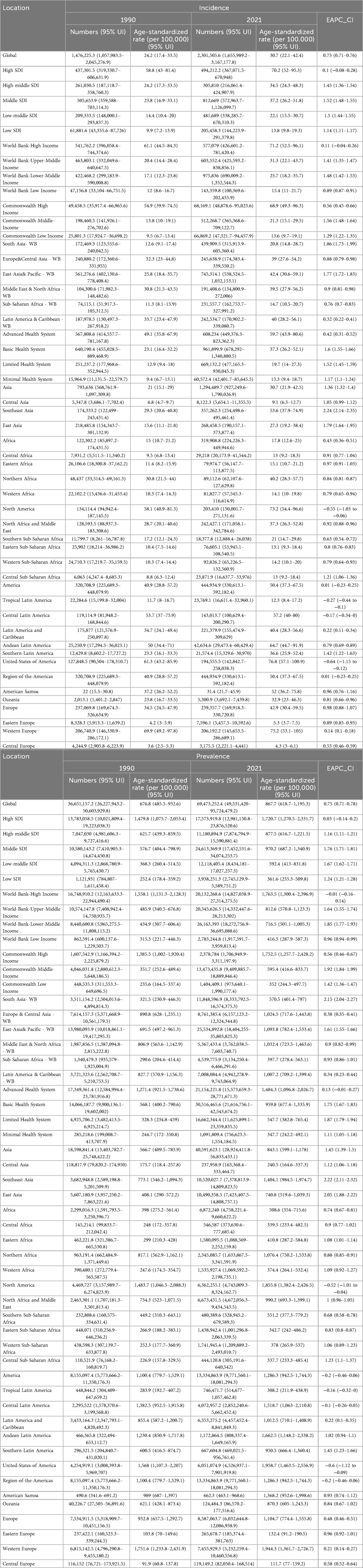 Table 1. Changes in the number of incident cases, prevalent cases, age-standardized incidence rate (ASIR), age-standardized prevalence rate (ASPR), and estimated annual percent change (EAPC) of PCOS globally and in GBD regions in 1990 and 2021.