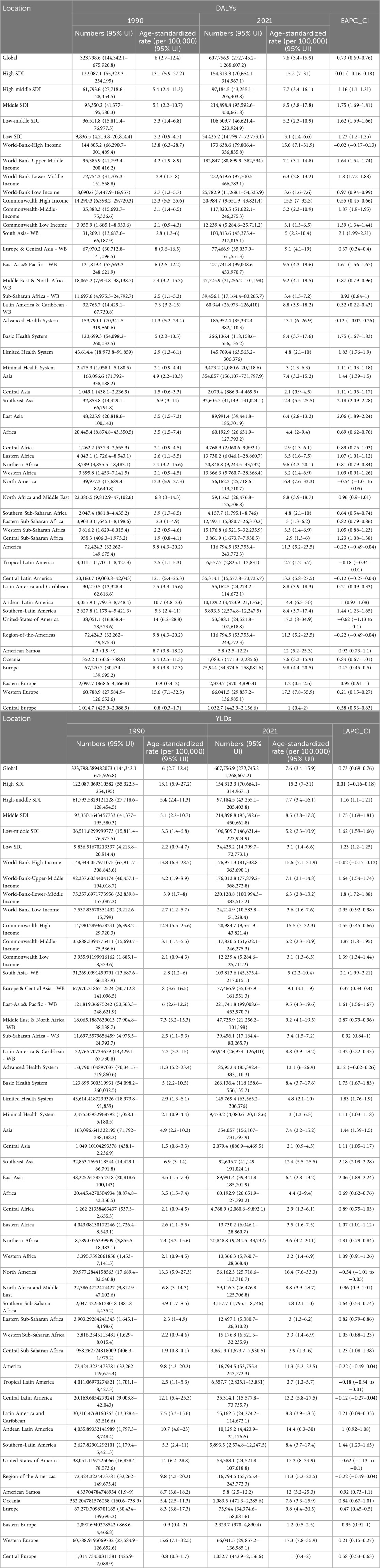 Table 2. Changes in DALYs, YLDs, ASR_DALYs, ASR_DALYs, and EAPC of PCOS in the world and GBD regions in 1990 and 2021.