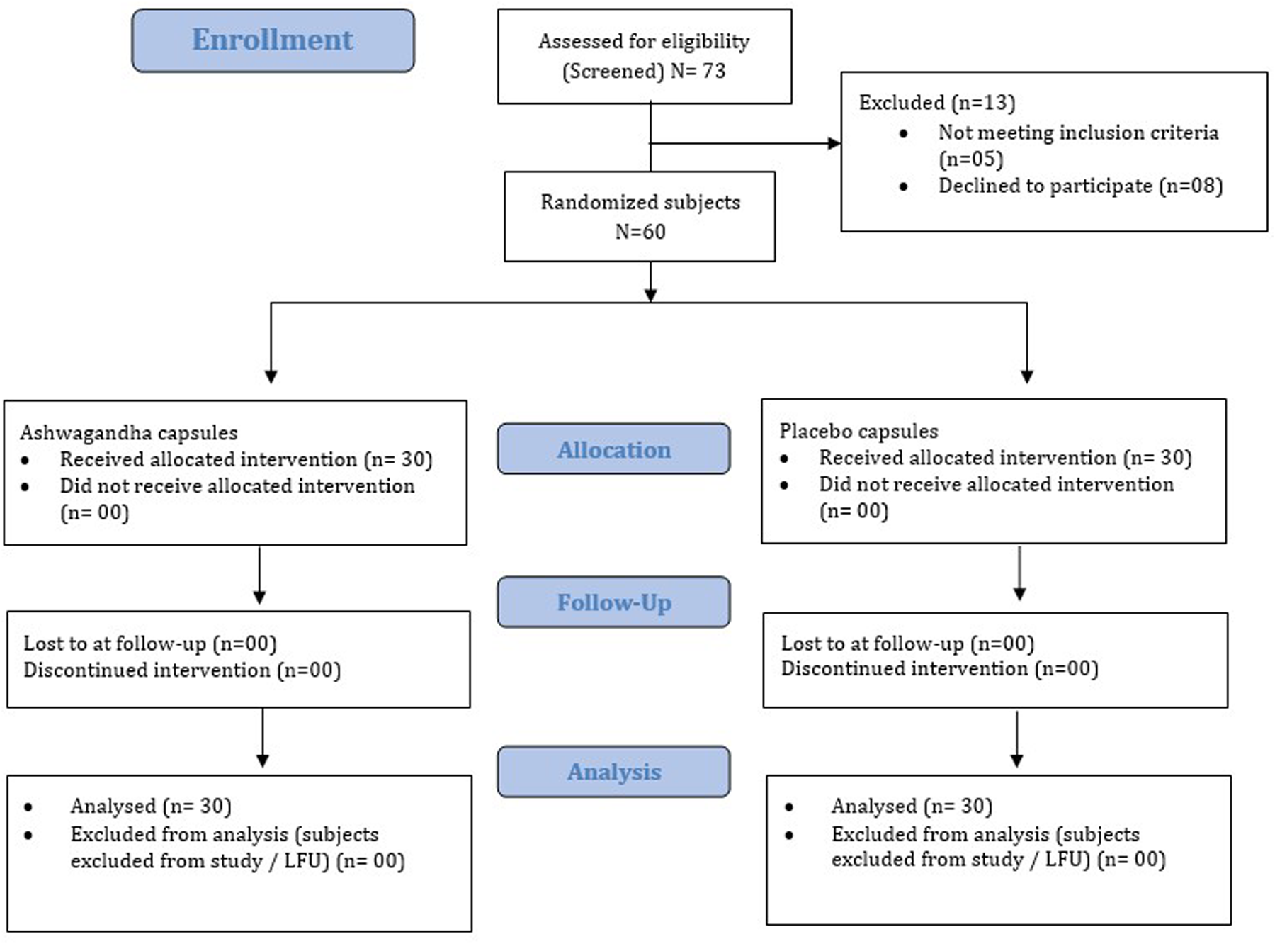 The sample size was calculated based on the primary endpoint of the study. The sample size calculation incorporated testing the hypothesis with a 5% level of significance and adequate power. The assumptions for the parameters, the effect size, and the standard deviation were based on past similar studies. Assuming the mean change in Menopause Rating Scale (MRS) score as 1.67 and 2.1 in the ARE and placebo (PL) arms respectively, the common standard deviation as 0.48, two-sided level of significance as 5%, and power as 90%, the study needed 54 evaluable subjects (27 subjects in each arm) to show superiority of ARE over PL in terms of change in MRS score. However, 60 women (30 in each group) participated in the study.