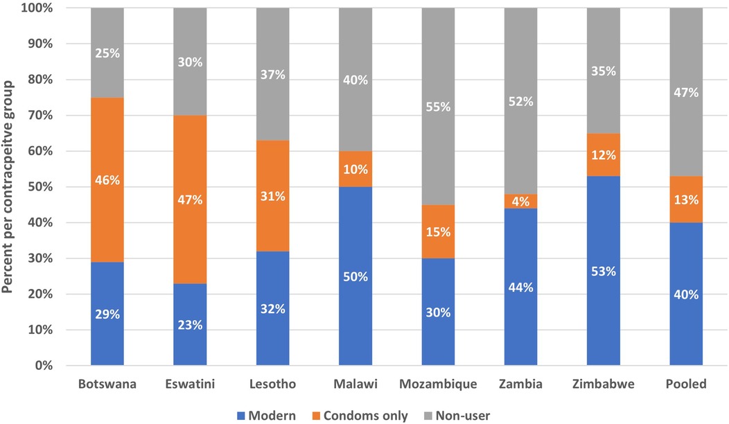 Results: Among the 11,094 AGYW, contraceptive use (male or female sterilization, IUD, implants, injectables, pills, condoms) ranged from 45.0% in Mozambique to 75.1% in Botswana. Condoms were the most frequently reported method in four of seven countries (Botswana 61% of those using modern methods use condoms, Eswatini 66%, Lesotho 49% and Mozambique 33%). Dual method (use of any modern contraceptive method plus a condom) ranged from <1% in Malawi to 15% in Botswana. When conducting a pooled multivariable logistic regression, higher odds of modern contraceptive use was associated with higher education [Odds Ratio (OR) 1.7, 95% Confidence Interval (CI) 1.5–2.0], being in the highest wealth quintile (OR 1.5, 95% CI 1.2- 2.0), and having children (one birth: OR 2.0 95% CI 1.7–2.4), two or more: (2.5, 95% CI 2.0–3.0), but was lower among AGYW living with HIV (OR 0.7 95% CI 0.6–0.9).