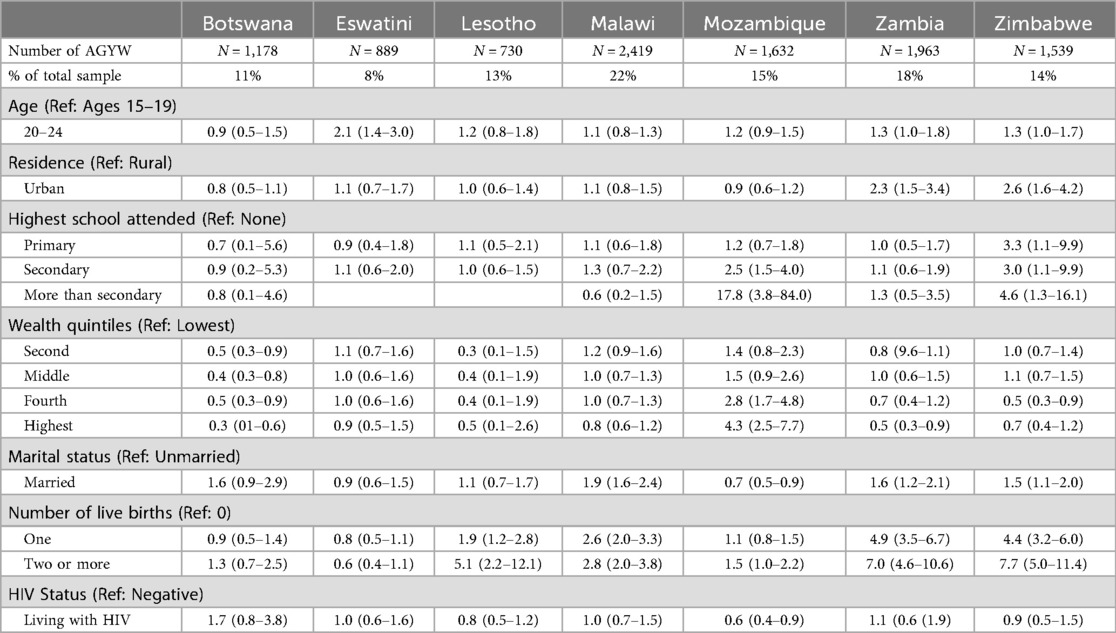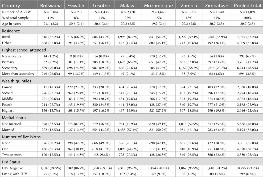 A total of 11,094 AGYW were included in this analysis; by country: Botswana (1,184), Eswatini (907), Lesotho (1,435), Malawi (2,420), Mozambique (1,643), Zambia (1,965), Zimbabwe (1,540) (Table 1). The pooled mean age was 20.2 years (SE 2.5), 93.3% had primary education or higher, and 52.0% were married. Overall, 35.8% were nulliparous, 38.7% reported one live birth and 25.4% reported two or more live births. Seven (6.8%) percent were living with HIV.