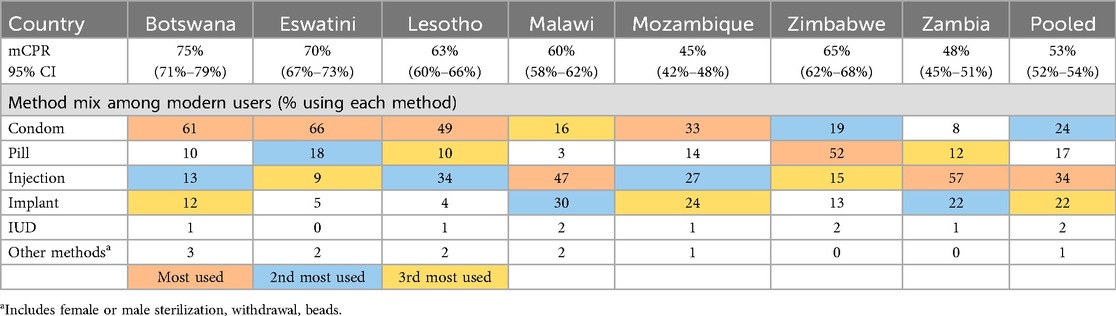Table 2. Modern contraceptive prevalence rate (mCPR) and method Mix among users by country among adolescent girls and young women, 2019-2022.