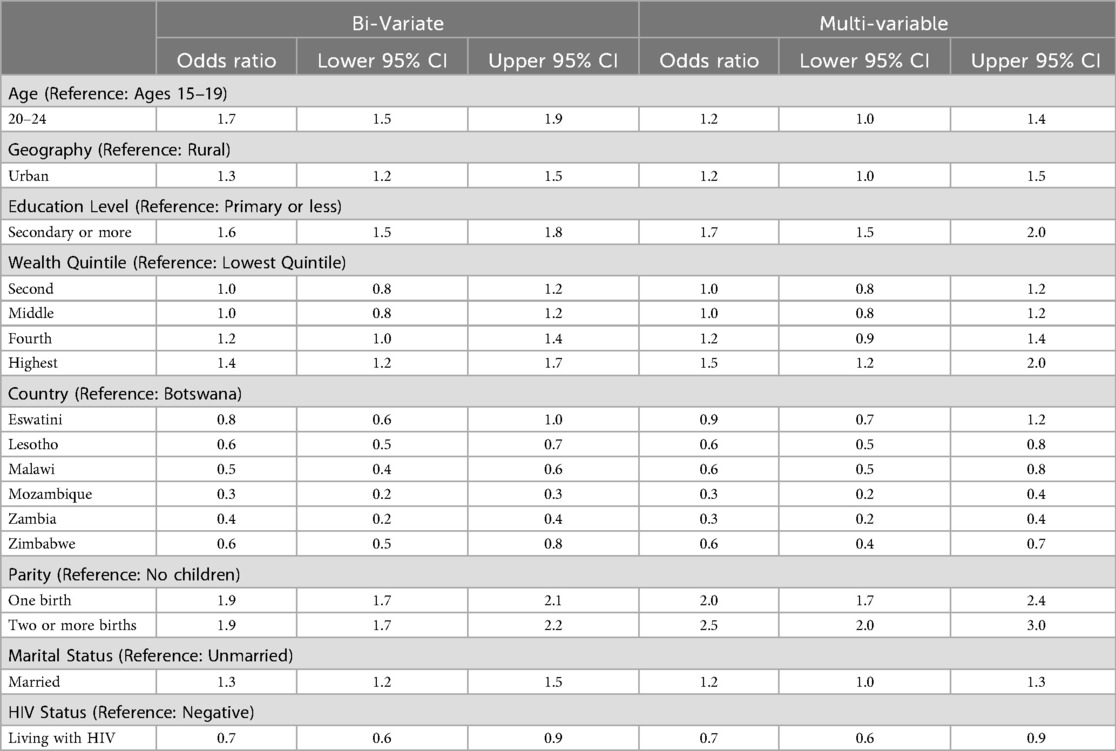 This study makes several important contributions. The study presents data on the prevalence of modern contraceptive use among a population at high risk for undesired pregnancy, emphasizing the current state of family planning efforts in the region. Moreover, it provides insights into the method mix among AGYW in Southern Africa, highlighting the heavy reliance on condoms in over half the countries. It also identifies the key determinants of contraceptive use across the population, which align with other literature from across SSA. The pooled results increased the sample size and found AGYW living with HIV had lower odds of modern contraceptive use compared to HIV-negative AGYW, which was not apparent in country-specific analysis. Overall, the findings highlight differences by country and can inform policy and programmatic interventions aimed at improving contraceptive access and uptake among AGYW in Southern Africa. Given sexual activity is often sporadic among young people, they may prefer coital-specific methods over long-acting methods. Infrequent sex may demotivate long-acting contraceptive use thus biomedical research should not abandon development of improved or new short-acting options. For example, emergency contraception is used frequently among young people in Eswatini (29).