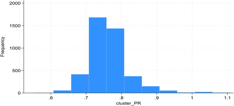 The histogram was created to examine the distribution of cluster-specific prevalence ratios for second level variable (distance to health facility). The results indicated that the cluster-specific prevalence ratios for distance to health facility was normally distributed (see Figure 2).