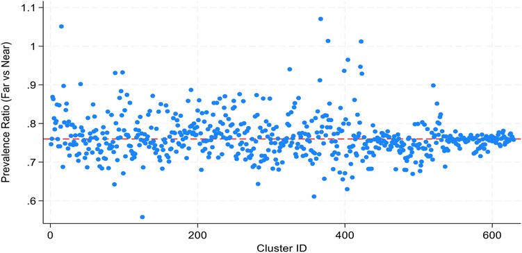 However, the effect of distance varied significantly across clusters/communities (random slope variance = 0.153, (95% CI: 0.058–0.406), indicating that in some areas distance is a much stronger barrier, while in others it is weaker or negligible. Accounting for this heterogeneity, the estimated cluster-specific risk ratios ranged from 0.354 (65% less prevalence) to 1.639 (64% higher prevalence), highlighting that in certain communities' distance may not be a barrier and could even be associated with higher ANC attendance.