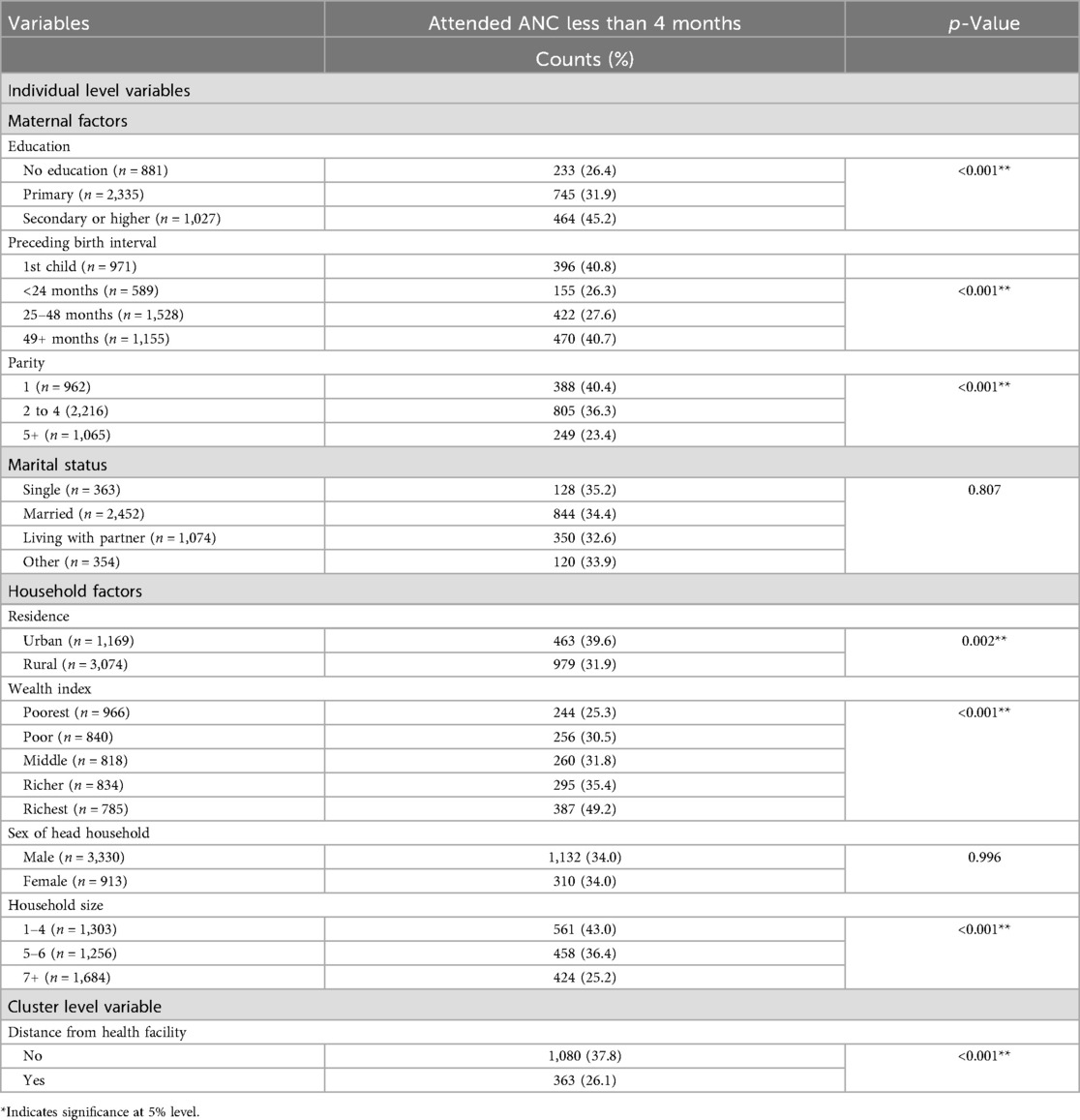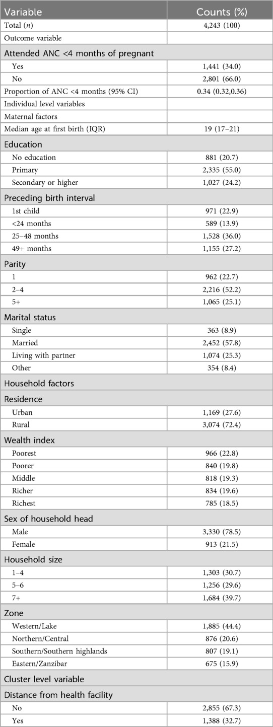 Methods: This study analysed secondary data involving a weighted sample size of 4,243 pregnant women aged 15–49 years from the 2022 Tanzania Demographic and Health Survey (TDHS). The analysis adapted a two-level multilevel weighted modified Poisson regression model using Stata 18 software. The dependent variable, “ANC in the first trimester of pregnancy” defined as the binary outcome variable. The independent variables included maternal factors and household factors.