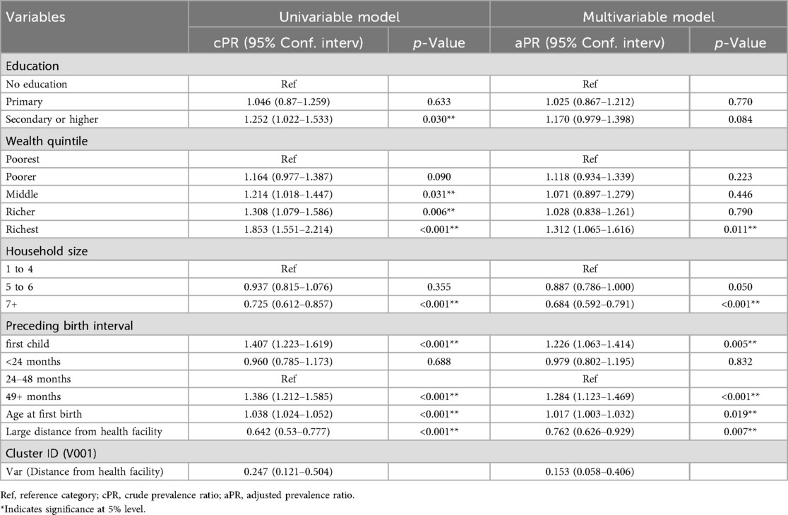 The study used a two-level multilevel modified Poisson regression model with a log link, estimating prevalence ratios for ANC in the first trimester. The model adjusts for multiple socio-demographic predictors, accounts for clustering at the community level (random intercepts), and allows the effect of facility distance to vary across clusters (random slopes). The multi-level model was performed using melogit Stata command along with pweight option to account for multi-stage sampling to ensure representativeness of the sample.