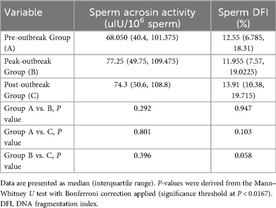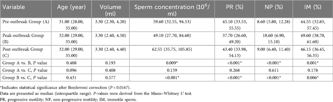 Initial comparisons of semen parameters across the three study groups (Pre-outbreak, Peak-outbreak, Post-outbreak) were performed using the Kruskal–Wallis H test to assess for an overall significant difference. If the Kruskal–Wallis test was significant, post-hoc pairwise comparisons were then conducted using the Mann–Whitney U test. A Bonferroni correction was applied to account for multiple comparisons, with a corrected p-value of P < 0.0167 (0.05/3) considered statistically significant.