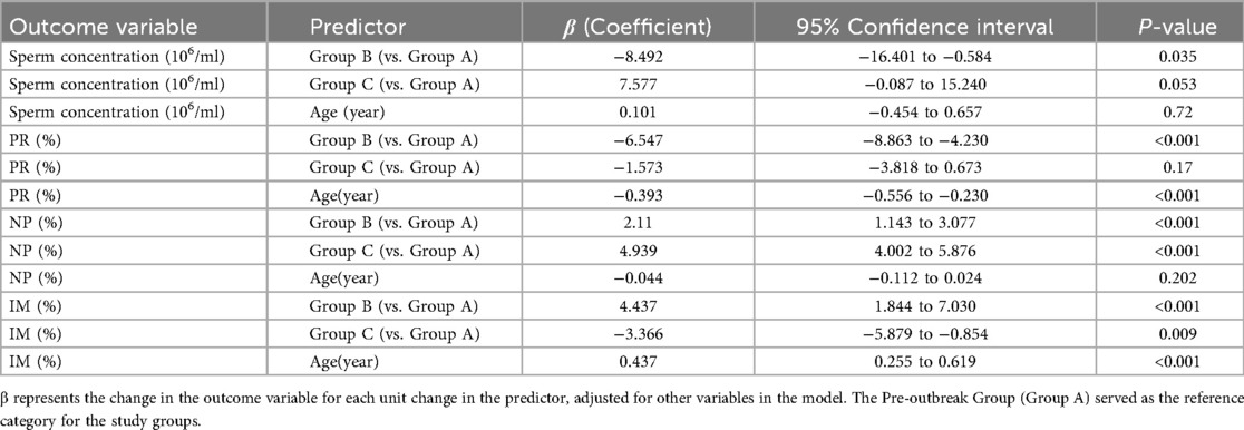 To account for the potential confounding effect of age, a multivariable linear regression analysis was performed (Table 3). After adjusting for age, the Peak-outbreak Group (Group B) remained significantly associated with a decrease in sperm concentration (β = −8.492, P = 0.035) and progressive motility (β = −6.547, P < 0.001), and an increase in non-progressive and immotile sperm percentages compared to the Pre-outbreak Group (Group A). For the Post-outbreak Group (Group C), no significant differences in sperm concentration or progressive motility were observed when compared to the Pre-outbreak reference group. However, a significant increase in non-progressive motility and a significant decrease in immotile sperm percentage were noted. The analysis also identified age as a significant independent predictor, with increasing age being associated with a significant decrease in progressive motility and an increase in immotile sperm (P < 0.001 for both).