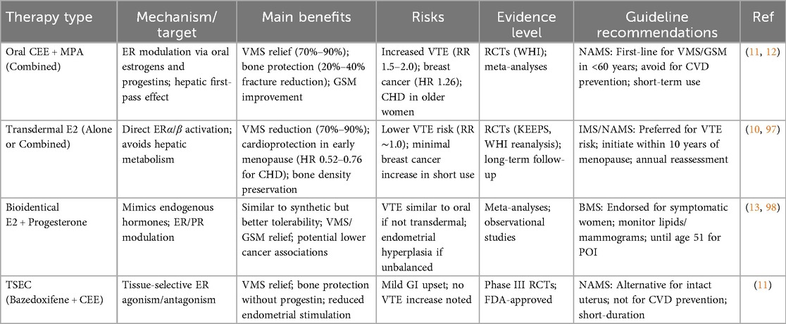 Table 1. Comparison of menopausal hormone therapy (MHT) formulations: efficacy, risks, and guideline recommendations.