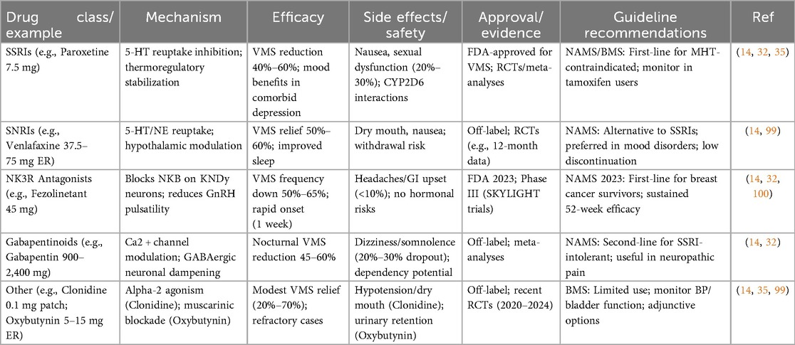 Non-hormonal pharmacological options have become increasingly vital in menopause management, particularly for women contraindicated for menopausal hormone therapy (MHT) due to conditions such as breast cancer, thromboembolic disorders, or personal preferences to avoid hormones (14, 31). These therapies primarily target vasomotor symptoms (VMS), such as hot flashes and night sweats, which affect up to 80% of menopausal women and significantly impair quality of life (32). Unlike MHT, non-hormonal agents do not restore estrogen levels but modulate neurotransmitter pathways, thermoregulatory centers, or other physiological mechanisms implicated in menopausal symptoms (33). Recent advancements, including FDA approvals and updated guidelines from 2020 to 2025, have expanded the evidence base, emphasizing efficacy, tolerability, and patient-centered selection (32, 34). This section reviews key classes, including selective serotonin reuptake inhibitors (SSRIs) and serotonin-norepinephrine reuptake inhibitors (SNRIs), neurokinin-3 receptor (NK3R) antagonists, gabapentinoids, and other agents, focusing on mechanisms, clinical evidence, and guidelines.