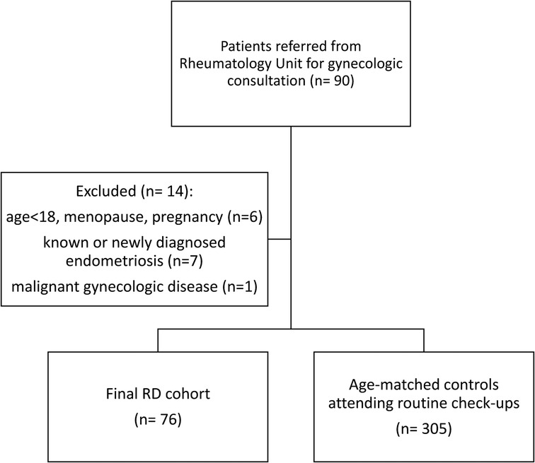 The present observational cohort study included a group of patients with RD, referred from the Rheumatology Unit to the Gynecology Unit at Careggi University Hospital, Florence, over a 1-year period. As part of the multidisciplinary care model implemented at our institution, gynecological consultations are included in the comprehensive evaluation protocol, aiming to either identify potential gynecologic comorbidities or manage gynecologic symptoms related to RDs. A control group of age-matched women (n = 305), not affected by RD and undergoing routine gynecological checkups, was also included for comparison.