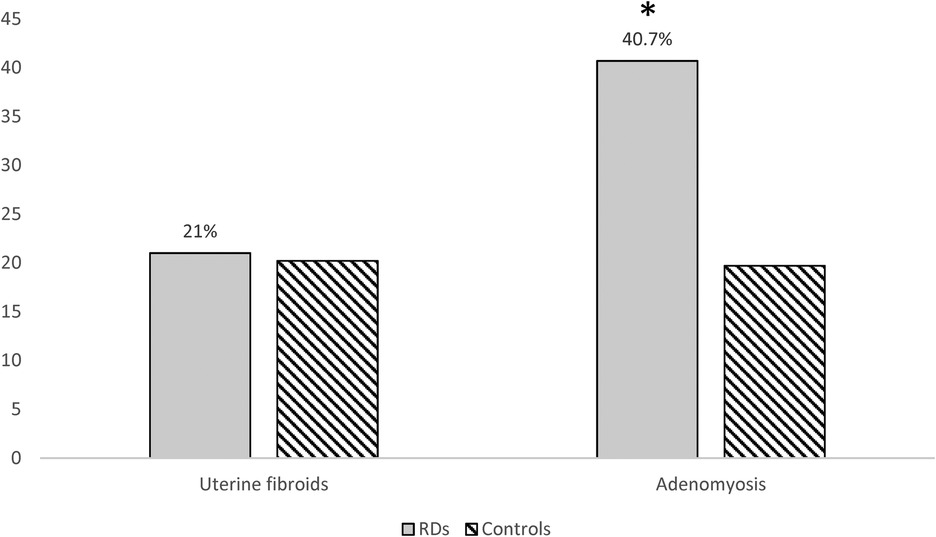 Our primary objective was to compare the prevalence of adenomyosis in women with RDs vs. age-matched controls. Secondary objectives were to assess the association between adenomyosis and menstruation-related symptoms, including abnormal uterine bleeding (AUB), heavy menstrual bleeding (HMB), dysmenorrhea and dyspareunia; and to compare the prevalence of uterine fibroids between groups.