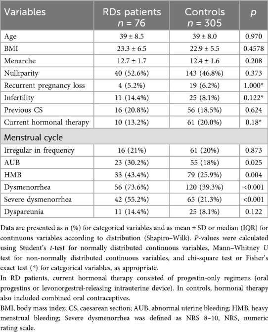 Almost all RD patients (98.6%) were receiving treatment for their underlying disease. Baseline demographic and clinical characteristics of RD patients and controls are summarized in Table 1. No significant differences were observed between the two groups in term of age, nulliparity, infertility, previous caesarean section and current hormonal treatment. However, when evaluating menstrual cycle symptoms and gynecological pain, women with RDs reported significantly higher rates of AUB (39.5% vs. 26.2%; p = 0.025), HMB (43.4% vs. 25.9%; p = 0.004) and severe dysmenorrhea (55.2% vs. 21.3%; p < 0.001) compared to controls (Table 1).