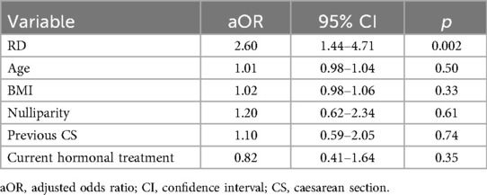 All the data were reported in an electronic database and the statistical analysis was performed by using IBM SPSS Statistics software, version 22 (IBM Corporation, Armonk, NY, United States). Descriptive statistics were performed: continuous variables are expressed as the mean (±standard deviation, SD), whereas for categorical data, absolute and relative frequencies were calculated. Normality of continuous variables was assessed with the Shapiro–Wilk test. Continuous parameters were evaluated by Student's t test for normally distributed data, otherwise the Mann–Whitney test was applied. To evaluate the associations between categorical variables and patient groups a chi-square test or Fisher's exact test were used. Effect sizes for categorical outcomes were expressed as odds ratios (OR) with 95% confidence intervals, derived from 2 × 2 contingency tables. Additionally, a multivariable logistic regression analysis was performed to estimate the association between RD status and adenomyosis, adjusting for potential confounders. Variables included in the model were age, BMI, nulliparity, previous caesarean section, and current hormonal therapy. These covariates were selected a priori based on clinical relevance and data availability. Results are reported as adjusted odds ratios (aOR) with 95% confidence intervals (CI). A p-value < 0.05 was considered statistically significant.