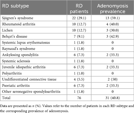In conclusion, this study highlights a significantly higher prevalence of adenomyosis in women with RDs, with important implications for both clinical practice and future research. These findings suggest a potential role of systemic inflammation and immune dysregulation in adenomyosis pathophysiology and underscore the value of interdisciplinary management. Greater awareness of this association is crucial for rheumatologists and gynecologists, as early recognition of menstrual symptoms such as HMB or severe dysmenorrhea should prompt timely gynecologic referral, given that RD patients are at increased risk for adenomyosis. Considering the well-documented impact of adenomyosis on fertility and pregnancy outcomes (40), its coexistence with RDs may further exacerbate reproductive risks already present in this population (41, 42). Strengthening collaboration between rheumatology and gynecology, alongside continued investigation into shared mechanisms, may lead to earlier diagnosis, improved patient care, and the development of targeted therapeutic strategies.