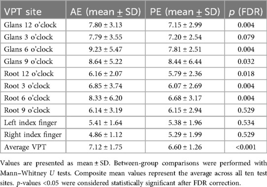 VPT results at ten anatomical sites are summarized in Table 1. After FDR correction, several penile sites demonstrated significantly higher thresholds in the AE group compared with PE. Specifically, differences were observed at the glans 12 o'clock (7.80 ± 3.13 vs. 7.15 ± 2.99, p = 0.004, r = −0.163), glans 6 o'clock (9.23 ± 5.47 vs. 7.81 ± 2.51, p = 0.004, r = −0.156), glans 9 o'clock (8.64 ± 5.22 vs. 8.44 ± 6.44, p = 0.032, r = −0.116), root 12 o'clock (6.16 ± 2.07 vs. 5.79 ± 2.36, p = 0.018, r = −0.130), root 3 o'clock (6.85 ± 3.74 vs. 6.07 ± 2.69, p = 0.004, r = −0.159), and root 6 o'clock (8.33 ± 6.20 vs. 6.68 ± 3.17, p = 0.004, r = −0.169). In contrast, thresholds at glans 3 o'clock (p = 0.079), root 9 o'clock (p = 0.529), and both index fingers (p > 0.5) did not differ significantly.