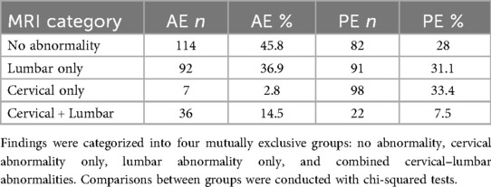 These distributions suggest that AE is characterized by either structurally normal imaging or combined cervical–lumbar involvement, whereas PE is most strongly associated with cervical pathology alone.