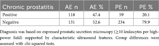 The prevalence of chronic prostatitis differed sharply between groups (Table 3). Nearly half of AE patients were positive on expressed prostatic secretion microscopy and ultrasound criteria (118/249, 47.4%), compared with only one fifth of PE patients (59/293, 20.1%; χ2 = 45.46, p < 0.001). Conversely, prostatitis was absent in four out of five PE patients but in only half of AE cases, underscoring a significant difference in prevalence between the groups.