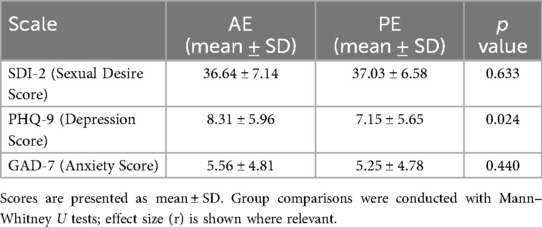 Group comparisons of psychological measures are summarized in Table 4. AE patients reported significantly higher depressive symptoms than PE (PHQ-9: 8.31 ± 5.96 vs. 7.15 ± 5.65, p = 0.024, r = −0.108). However, levels of sexual desire (SDI-2: 36.64 ± 7.14 vs. 37.03 ± 6.58, p = 0.633) and anxiety (GAD-7: 5.56 ± 4.81 vs. 5.25 ± 4.78, p = 0.440) were broadly similar across groups.