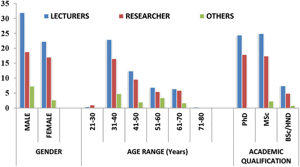 For the purpose of this study, all academic staff (from the universities, research institutions, and polytechnics) involved directly in teaching were grouped as lecturers. Staff involved strictly in research focused activities were grouped as researchers. Other academic staff involved in laboratory practicals such as technologists and instructors was grouped as others.
