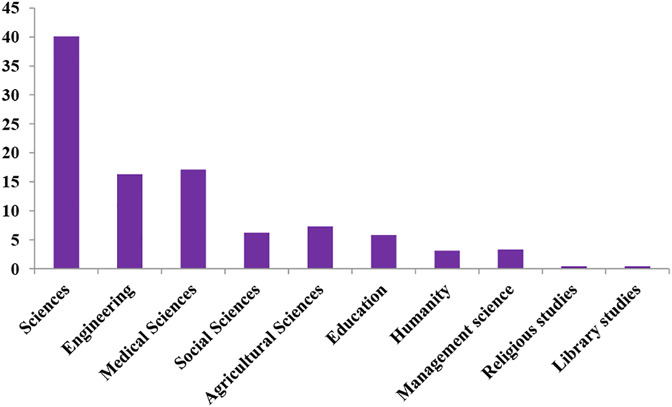 The majority (44.7%) of the participants were in the sciences, while 16.3% were in engineering, 17.5% medical sciences, 5.7% in social sciences, 2.3% humanities, and 5.6% in agricultural science (Figure 2). Overall, 70.3% of the respondents were full-time staff, 27.5% on sabbatical/secondment, and 2.2% were adjunct staff. Based on the designations of the participants, the lecturing cadre had the highest number with 46.1% of respondents, while 41.8% were researchers and 12.1% others.