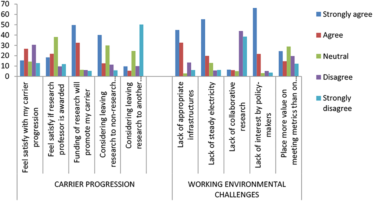 On participant’s career progression and working environmental challenges (Figure 3), 15.5% strongly agree that they feel satisfied with their career prospects working within the research environment. Exactly 21.9% agree that they will be fully satisfied if a research professor is awarded in research institutes. Precisely 49.7% strongly agree that funding of research will promote their career progression within research. Yet, 40.1% agree that they are considering leaving research to a non-research sector. However, 50.2% agree that they are considering leaving to another research sector. Notwithstanding, 45.0% strongly agree that there is a lack of appropriate infrastructure while 55.3% agree that there is a lack of steady electricity. Although, 43.5% disagree that there is a lack of collaborative research, about 66.2% agree that there is a lack of research interest by policymakers. Regrettably, 24.4% strongly agree that they place more value on meeting metrics than on quality research (Table 3).