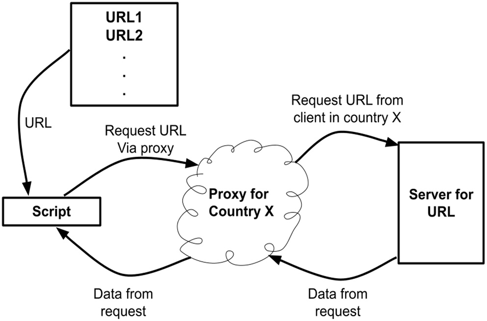 The proxy service provided by the company Bright Data25 (previously referred to as Luminati) was used to provide clients in each of the above countries. A schematic of the software can be found in Figure 4. Using the API of Bright Data for each country a request was made to download the URLs in the above list. The User-Agent string for the HTTP request was set to correspond to the most up to date chrome browser26. Download data was captured and stored in individual JSON files. This data includes the HTTP response status codes, the HTML downloaded if access was successful and error codes if access was unsuccessful. The data was gathered in August 2020.