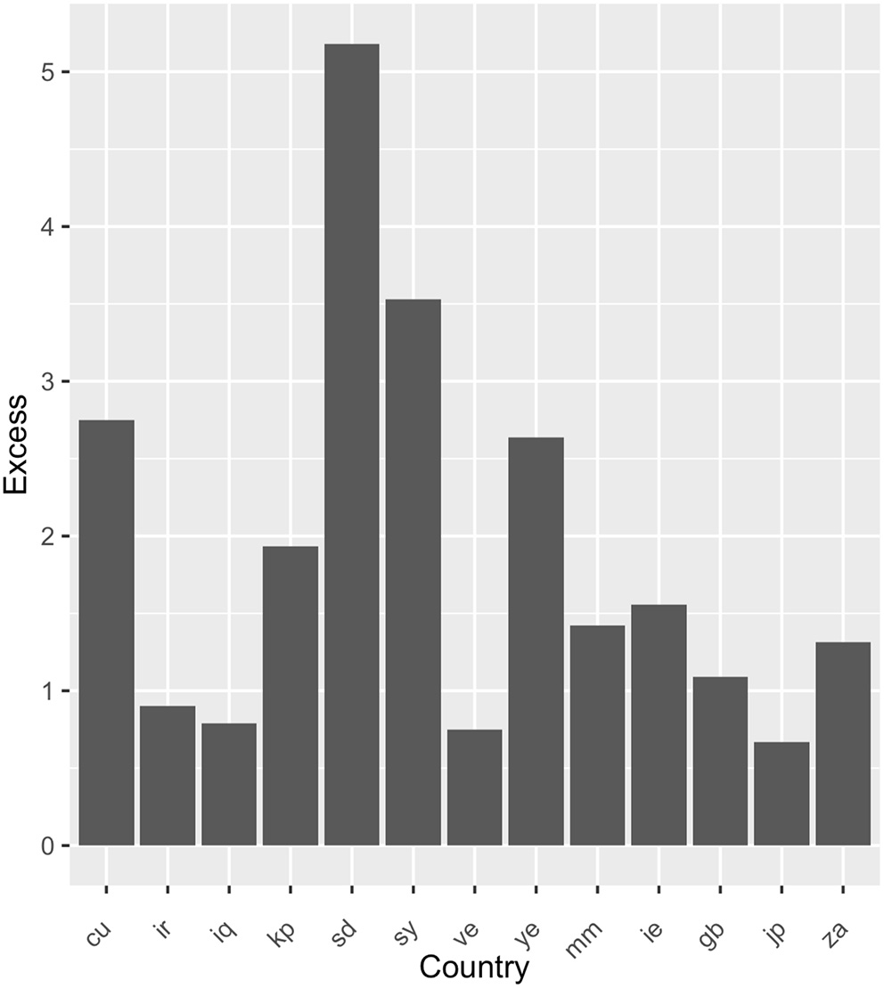 From the above results we find that countries have a variable level of access to the URLs. In particular, Cuba, Sudan, Syria, and Yemen (cu, sd, sy, and ye) are much more likely to be unable to download the URLs. Countries such as Ireland, Japan. and the United Kingdom (ie, jp, and gb) give a range of excess values indicating that the spread of values for Iran, Iraq, Venezuela, and Myanmar (ir, iq, ve, and mm) are not significant. This corresponds to cases where connectivity is poor.