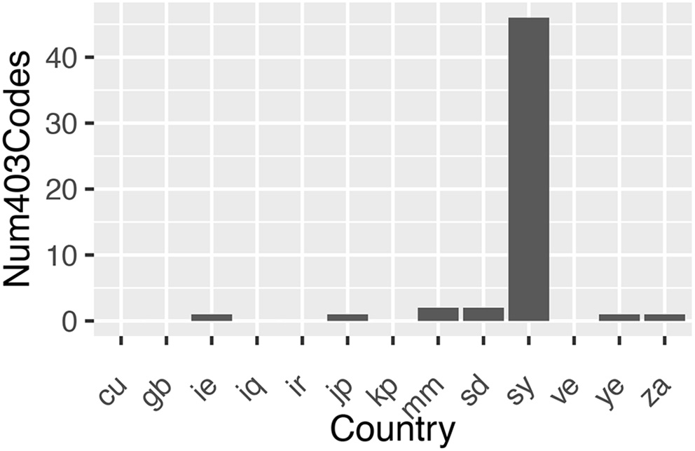 If a web server understands a request to access a URL from a client but refuses to authorize it then it returns a HTTP response status code of 403, as opposed to a response code of 200 if the request is successful. Using US again as a control, for each country the set of URLs which return a 403 response code for that country and returns a 200 response code for US were collated. The number found for each country are plotted in Figure 6. The URLs these correspond to are listed in the Appendix. As evidenced in Figure 6, the significant increase in 403 status codes for Syria (sy) suggests possible geoblocking.