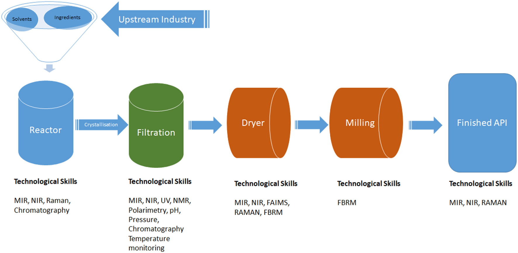 Schematic representation of the API production process and the technological skills required. Key: MIR, Magnetic Infrared Spectroscopy; NIR, Near Infrared Spectroscopy; Raman, Raman Spectroscopy; UV, Ultraviolet; NMR, Nuclear Magnetic Resonance; FAIMS, Field Asymmetric Ion Mobility Spectrometry; FBRM, Focused beam reflectance measurement. Source: adapted from Yazdanpanah (2021).
