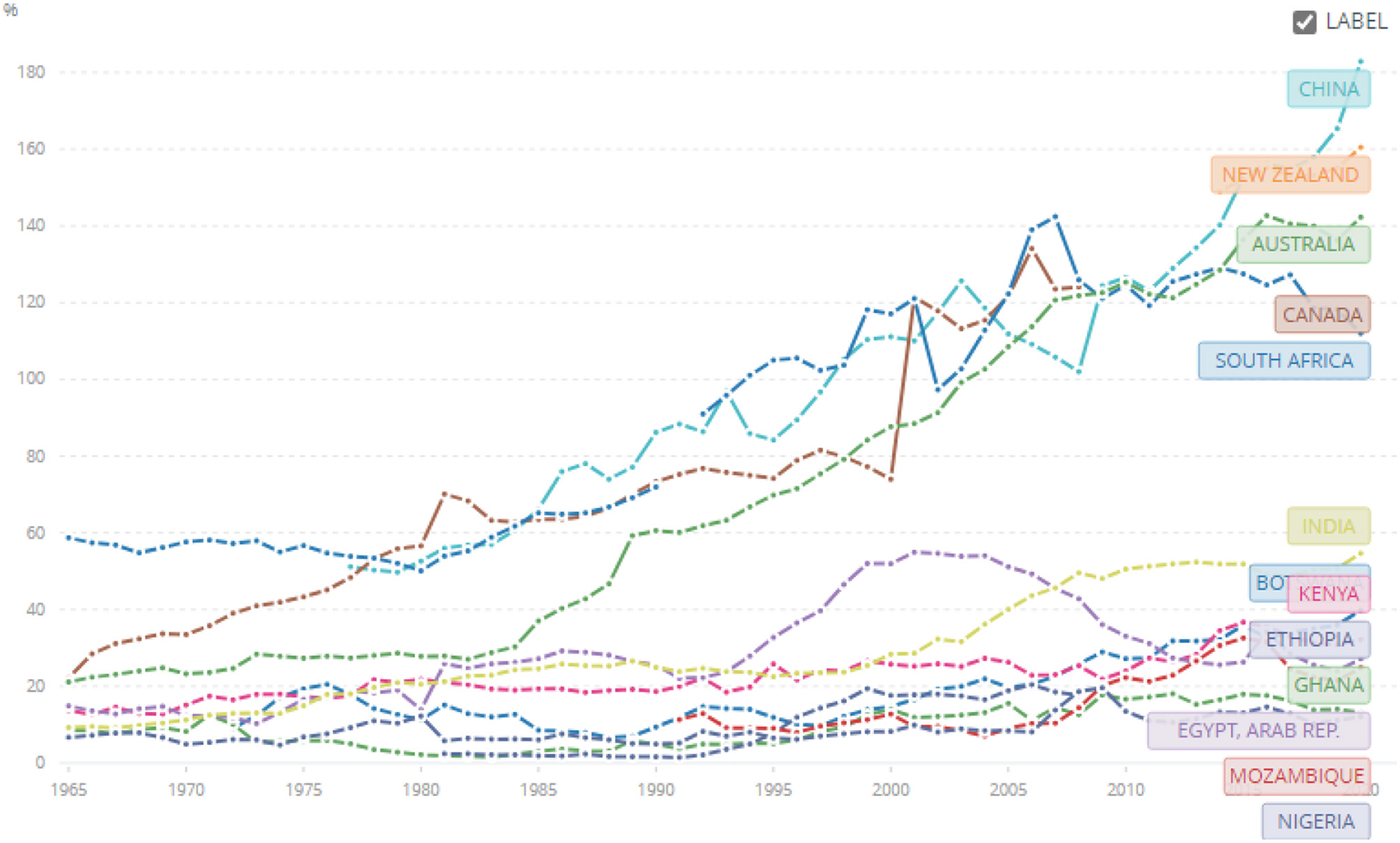 Domestic credit to the private sector (% of GDP) from 1965 to 2020 for Australia, Botswana, Ghana, Ethiopia, Kenya, China, Egypt, India, Mozambique, Nigeria, Canada, New Zealand, and South Africa. Source: World Bank Data: https://data.worldbank.org/indicator/FS.AST.PRVT.GD.ZS?end=2020&locations=BW-GH-ET-KE-CN-EG-IN-MZ-CA-NZ-ZA-AU-NG&name_desc=false&start=1965&view=chart&year=1971.