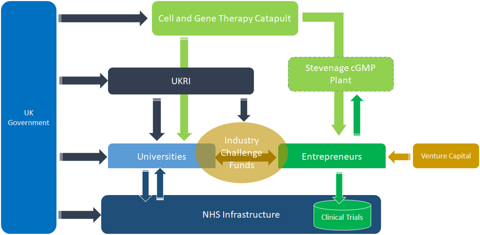 The government through various agencies funds the UK Research and Innovation (UKRI), the Cell and Gene Therapy Catapult (CGTC), entrepreneurs, universities, and the NHS infrastructure. These institutional interlinkages have been pivotal for the development of the UK regenerative medicine sector. UKRI also funds industry challenge funds, which facilitate university and industry collaborations. The CGTC was set up to support the sector through the provision of advice, collaborations, and seeking co-funding to develop technologies and innovations. UKRI has a budget allocated year on year that it uses to shape innovation trajectories. At the same time, universities, a key arm of the triple helix, are also funded by the government. Thus, the government funds institutions of knowledge generation, technology development, and commercialization, as well as innovation-bridging institutions such as the CGTC (Banda et al., 2018, 2019a,b). The argument is that if existing institutions have neither the capabilities nor reach to support radical innovations, then new institutions are built and purposed to support new technologies.