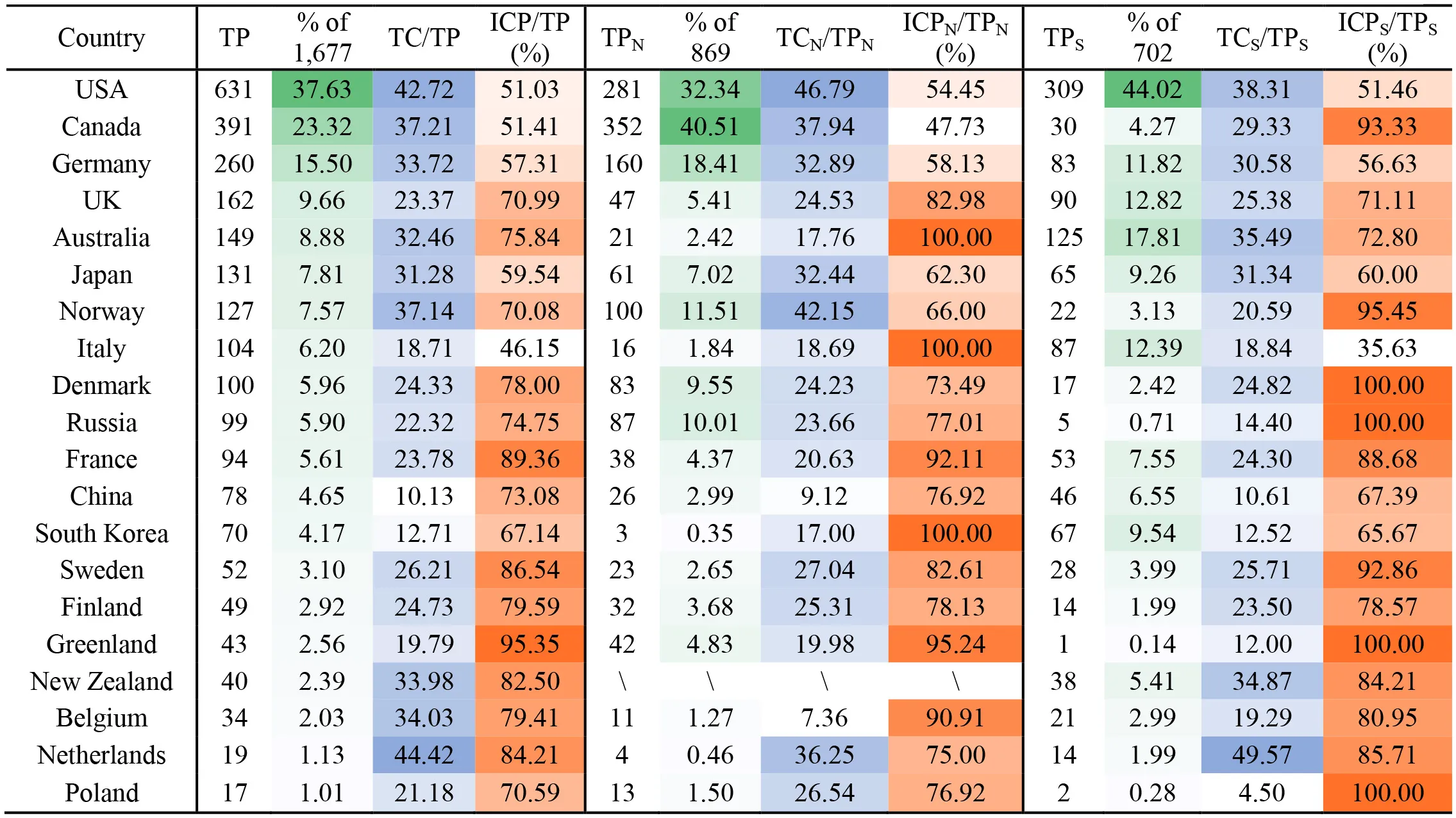 Table 6. Top 20 productive countries in the study of polar polynya from 1980 to 2021 with respect to the average number of citations per article (TC/TP) and the proportion of international collaboration publications (ICP/TP) for both polar, Arctic and Antarctic, respectively.