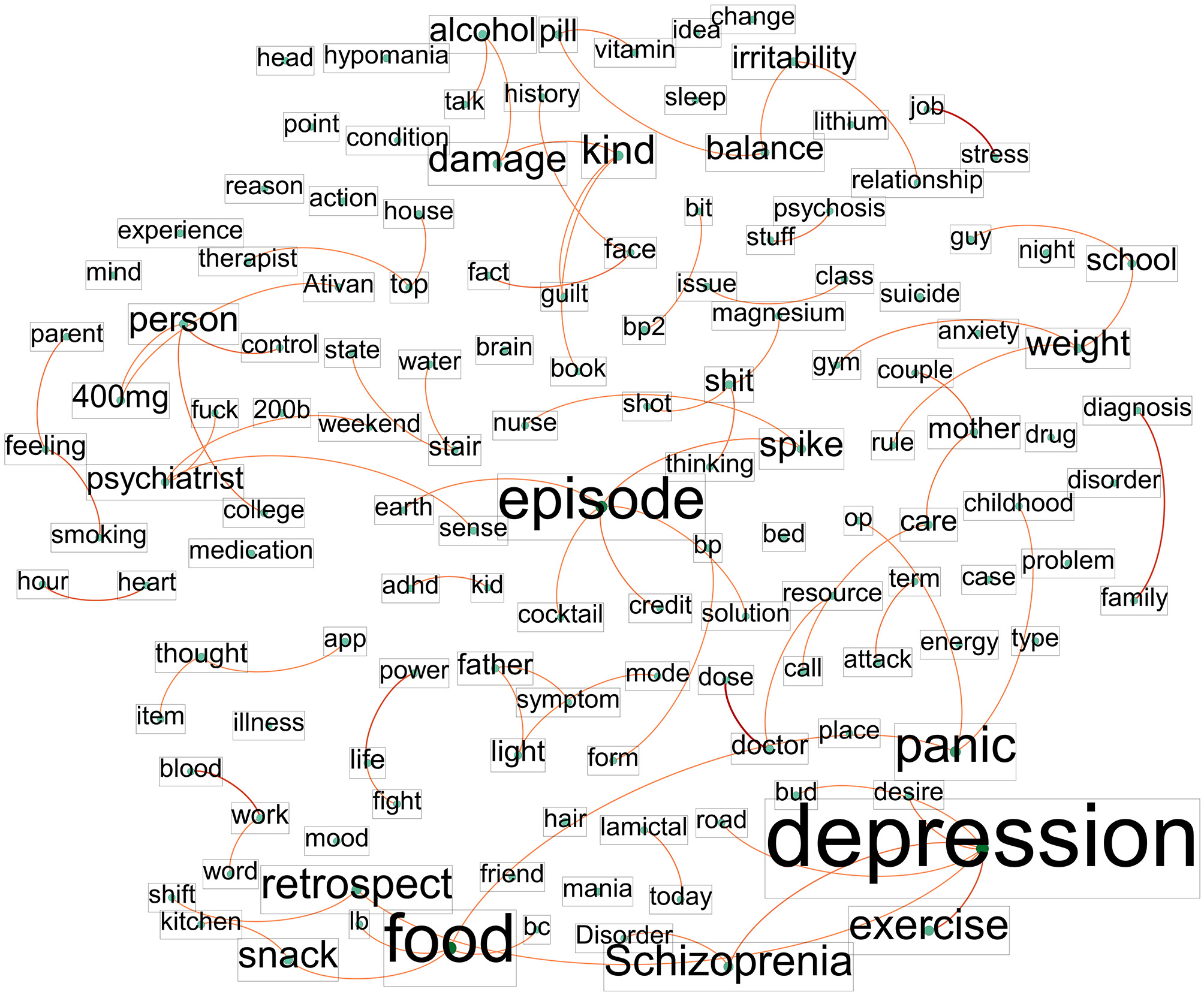 Figure 4 displays the co-occurrence network of words in the negative post text. The top-ranking terms, which play a crucial role as bridges in the network, are “depression” (0.000256), followed by “life” (0.000164), “episode” (0.000157), “shit” (0.000101), “psychiatrist” (0.000093), and “food” (0.000091). This graph reveals that individuals living with BD expressed concerns about recurrent disorders such as schizophrenia and obesity, along with symptoms of mood swings. Furthermore, they experienced irritability in their relationships with others and struggled with negative thoughts, including suicidal ideation. Notable word pairs identified in the network include depression-schizophrenia, life-fight, episode-spike, shit-thinking, food-panic, and irritability-relationship.