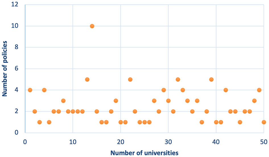 By analyzing the policy distribution characteristics, policy changes, policy diffusion, policy themes, and other factors, these measurements provided researchers with empirical data and objective descriptions of policies (Li et al., 2015). From the distribution of university RI policies (Figure 2), it is evident that all universities in the sample have formulated university-level RI policies; there is a total of 125 policies and an average of 2.5 policies per university. Further, 34 universities have promulgated multiple policies to regulate RI management, among which 18 universities have established more than or equal to three RI policies. They have also formulated regulations for RI management from different perspectives thus developing more comprehensive regulations. For example, Sichuan University established 10 RI policies, and Beijing Normal University, Hunan University, and Lanzhou University have each developed five RI policies.