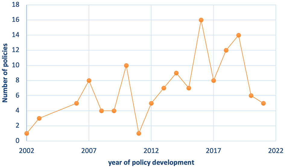 Figure 3. Distribution of the time of promulgation of RI policies in universities. The number RI policies developed/and implemented throughout the years. The x-axis shows the year of development/implementation, and the y-axis shows the number of policies.