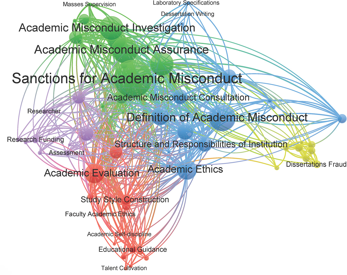 According to the clustering results in Figure 4, this study converges the thematic contents represented by the extracted keywords into five major sub-categories based on manual labeling: (1) RI construction: academic style construction, academic ethics construction, academic evaluation, scientific research data management, academic supervision, and self-regulatory awareness; (2) academic misconduct handling process: academic misconduct acceptance, academic misconduct; (3) definition of academic misconduct and RI: definition of academic misconduct, intellectual property rights, standardized citation, paper publication, paper writing, laboratory standards; (4) the process of handling dissertation falsification: reporting, investigating, and punishing academic dissertation falsification, quality of dissertation, responsible body; and (5) the code of conduct of scientific researchers: research funding, scientific research behavior norms, subject declaration, assessment and evaluation, academic review, education, and publicity.
