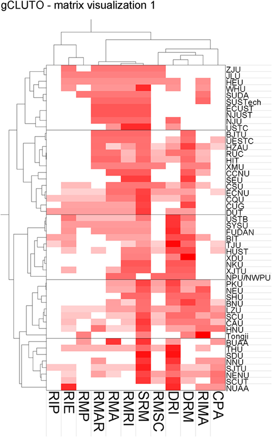 To further analyze the relationship between universities and RI policy topics, this study draws a clustering map of RI policy topics at the sampled universities based on the average cosine similarity among policy subject structures (Figure 5). According to the clustering results, the 50 colleges and universities can be divided into five types. The Y-axis in Figure 5 is 12 RI policy topics, and the horizontal coordinate is the top 50 sample universities. The lattice that crosses the rows and columns represents the weight of the college's publications on the policy subject; the colors, from light to dark, represent the university's emphasis on the subject, with deeper colors signifying greater focus.